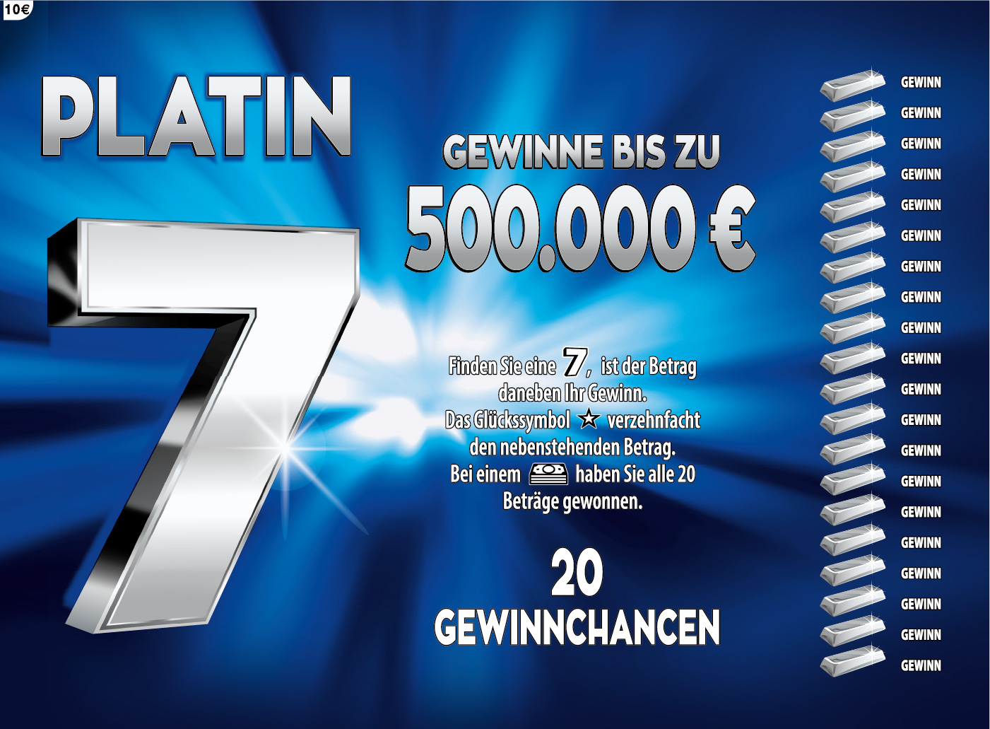 Neben Silber und Gold wird die 7-er Losfamilie nun mit einem besonders wertvollen Edelmetall versehen: Platin – besonders selten, besonders rein und daher schon immer äußerst begehrt. So ist es nur logisch, dass die Platin 7 die meisten Gewinnchancen und die höchsten Hauptgewinne innerhalb der Losfamilie mit sich bringt.